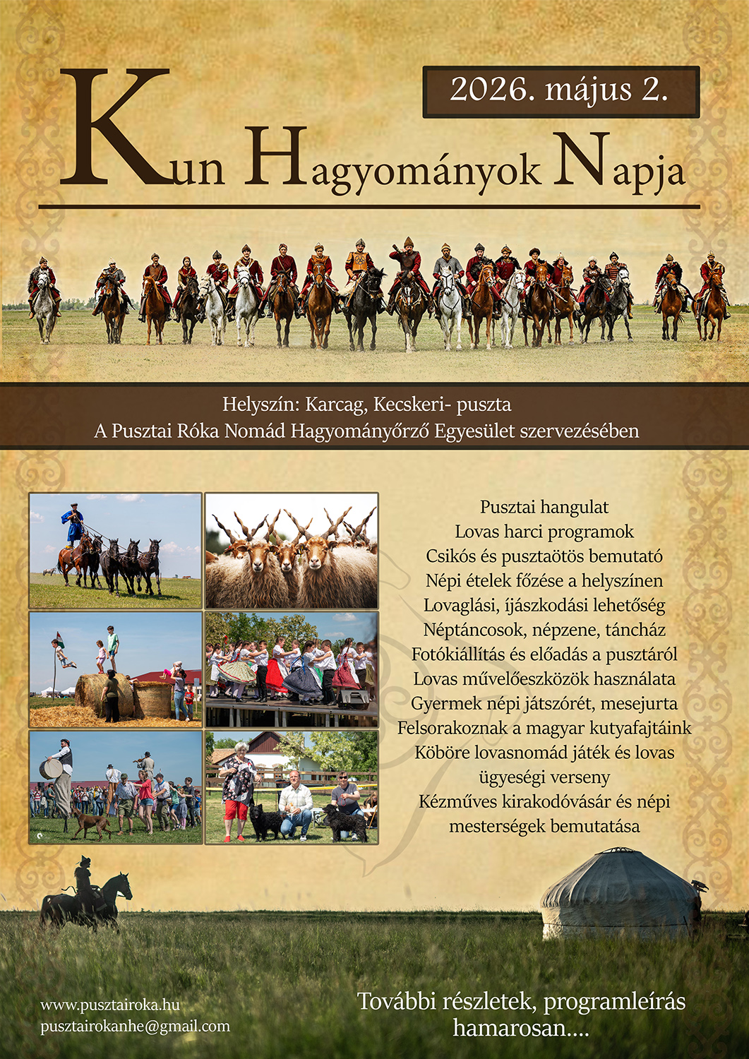Az esemény a Nyeszlettszájú Bakamászok gólyalábas kompániájának szórakoztató műsorával indult, majd következett a hivatalos, köszöntésekkel, díjkiosztóval és nyílzáporral fűszerezett megnyitó.Ezt követően a Pusztai Róka húsz lovas harcosa erős földi segédlet mellett bemutatta a Harc és Játék a lovasnomád hagyományban című műsorának eddigi legnagyobb ívű változatát. Ekkora létszámmal országos szinten sem nagyon tartanak hagyományőrző lovasbemutatót, így igen büszkék vagyunk a csapat teljesítményére. A büszkeséghez persze hozzátesz, hogy még jól is sikerült a produkció. A Fejezetek a magyar könnyűlovasság történetéből című bemutatóval pedig meghívtuk a nézőket egy történelmi kirándulásra, amely során betekintést nyerhettek a csataterek egyik leghatékonyabb fegyvernemének történetébe.Persze nem csak mi csillogtunk az esemény és a kellemesen tűző Nap alatt, hanem barátaink, hagyományőrző társaink is szerepet kaptak a pusztai színpadon. Klasszikus csikósprogrammal a hajdúszoboszlói csikósok, betyáros virtussal pedig a Kis-Dunamenti Betyárok szórakoztatták a nagyérdeműt, aki ezen kívül láthatott még izgalmas köböre mérkőzést, ahol a Magyar Hadak segítsége emelte a csapatot. A ló mellett az ember leghűségesebb társa a kutya, így a magyar kutyafajták is teret kaptak. Természetesen kultúránk egyik ékköve a magyar népzene és néptánc, így a nap során többször felléptek a Déryné Kultúrális Központ tánccsoportjai a Pipás zenekar kíséretében, az esemény zárását pedig a Fordulj Kispej Lovam zenés, táncos és nem mellesleg fantasztikus előadása biztosította.Az idelátogatók nem csak a színpad mellett szórakozhattak, hiszen a Bengecseg Alapítvány JátszóRétje, az íjászkodás vagy a lovaskocsizás jó programot biztosított kicsiknek-nagyoknak egyaránt. Az éhezők finom pusztai ételekkel biztosíthatták gyomruk jólétét, aki pedig vásárfiát szeretett volna hazavinni, az is megoldható volt remek kézműves vendégeink vásárában. Az Egyesület és a puszta életéről képet nyújtottak a lovardában berendezett fotókiállítások, amik mellett megtekinthetőek voltak a karcagi gyermekek kedves rajzai is.