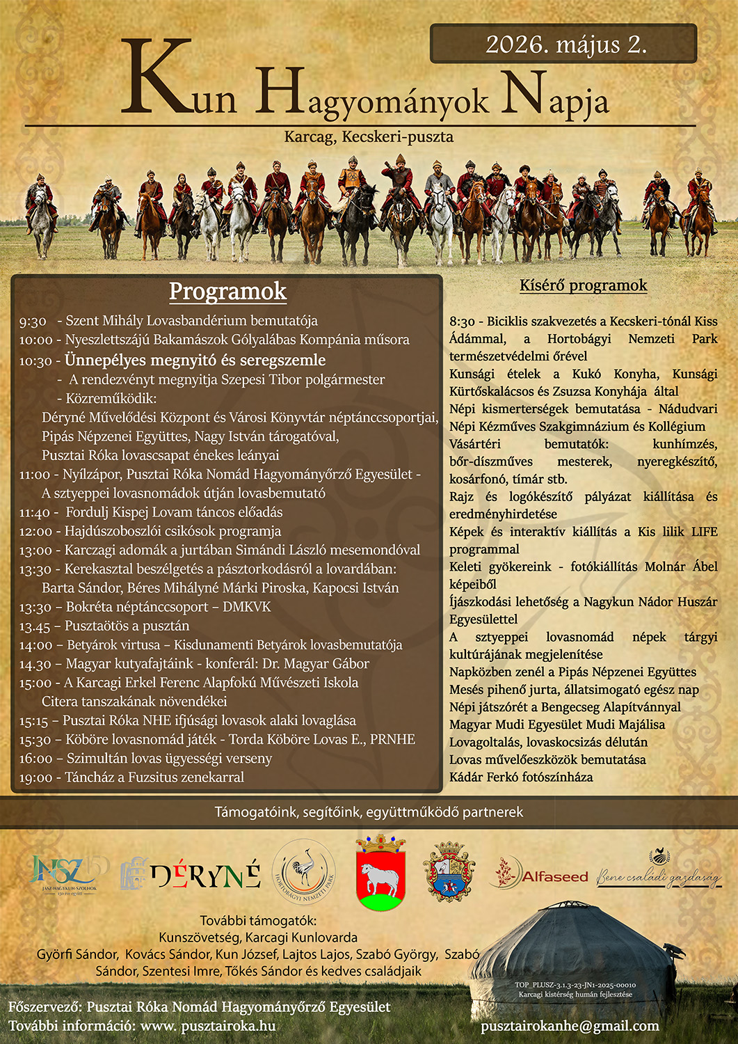 A nap folyamán számos kísérő program tette még gazdagabbá és emlékezetesebbé ezt az ünnepséget. Ilyen volt például a Mudi Fesztivál a Magyar Mudi Egyesület szervezésében, elismert bírák és neves tenyésztők közreműködésével. A szteppei lovasnépek tárgyi kultúrája került bemutatásra a nagyjurtában, valamint csontkovácsok dolgoztak a kisjurtában. Egész nap kézműves bemutatók és vásár volt különböző népművészeti alkotásokból, tájjellegű helyi élelmiszerekből. Az eredeti nagykunsági ételek főzésében a "Horváth-Kert Vendéglő" dolgozói jeleskedtek. Valamint a vendégeknek egész nap rendelkezésükre állt a lovaskocsikázás a Kecskeri-pusztán. Délután még sor került a lovasok körében - a közép-ázsiai sztyeppéken a mai napig igen népszerű - köböre lovasjátékra, mely a Nagykunságban maradt fent a 19. századig.